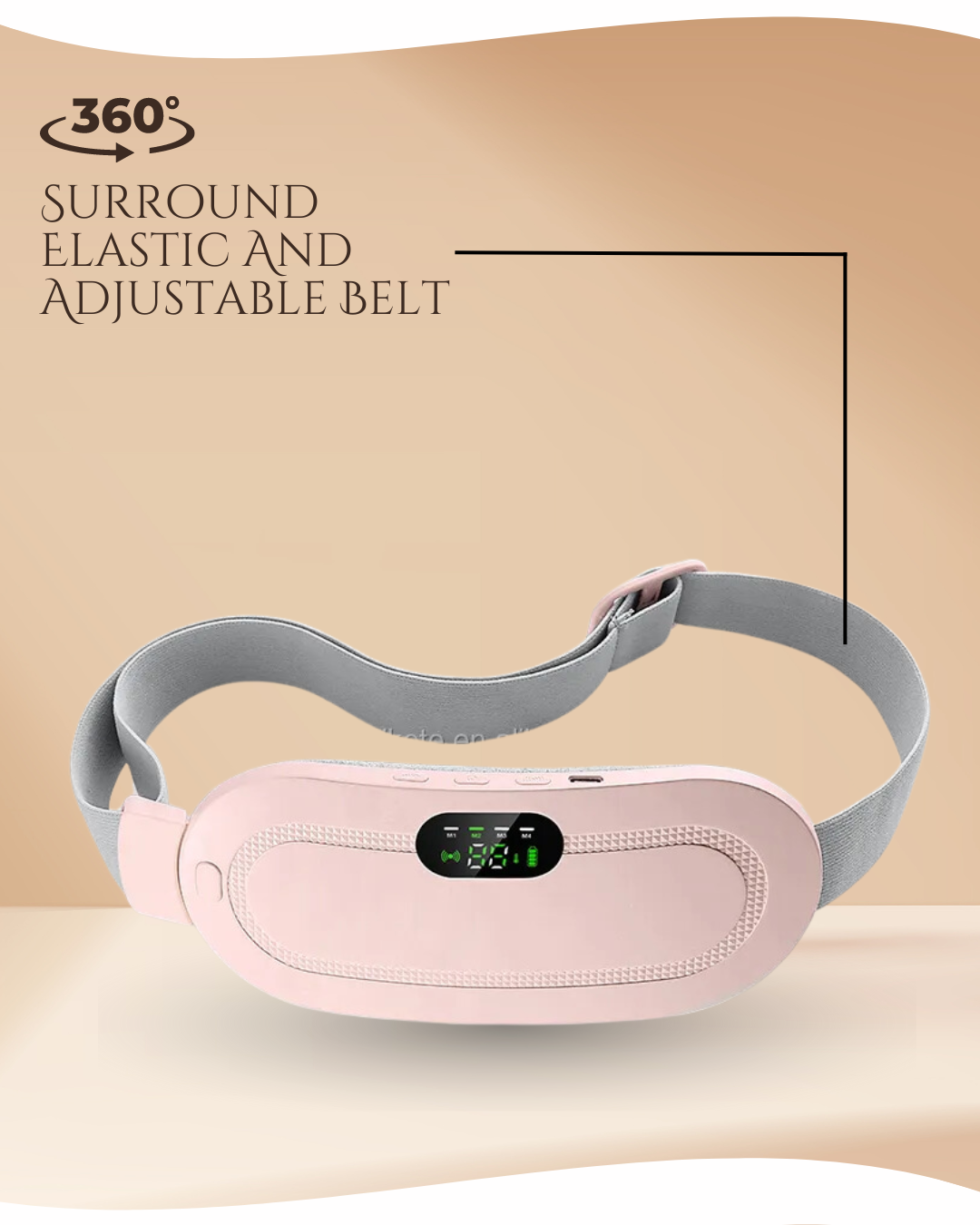 The 56-inch elastic and adjustable belt of the Comfomadic heating pad and massager ensures a secure, customizable fit for all body types, providing targeted comfort and effective pain relief during periods.