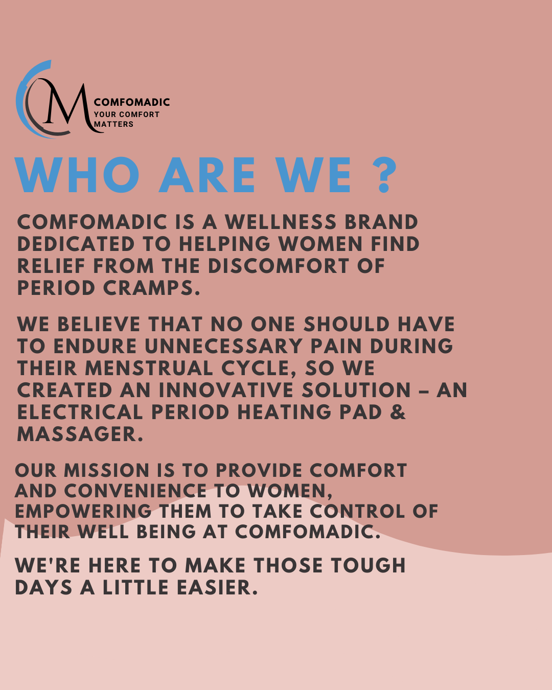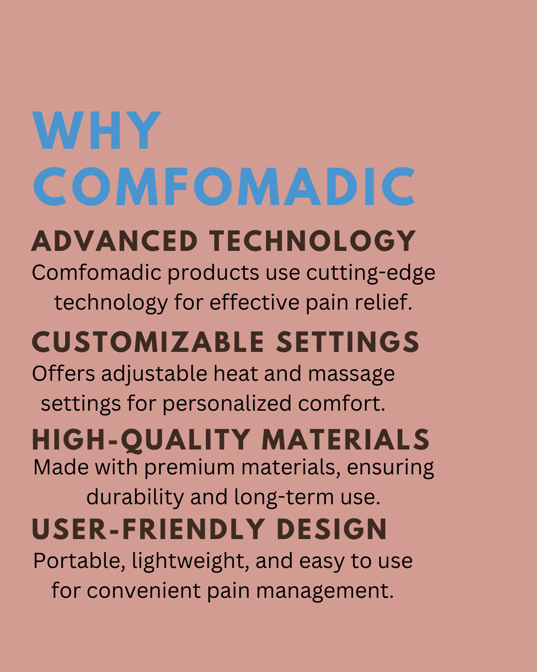The Comfort Heating Pad and Massager by Comfomadic provides soothing heat therapy and gentle massage, specifically designed for period pain relief. Heat therapy increases blood circulation, relaxes muscles, and alleviates cramps, while the massager enhances pain relief by reducing muscle tension and improving overall comfort during periods.